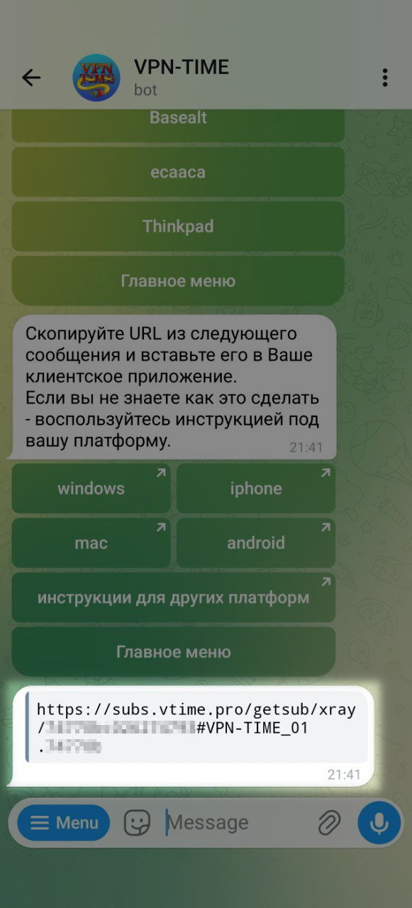 Если вы ещё не сделали Xray-ключ — зайдите в бота и сделайте новый ключ, указав тип подключения "xray".